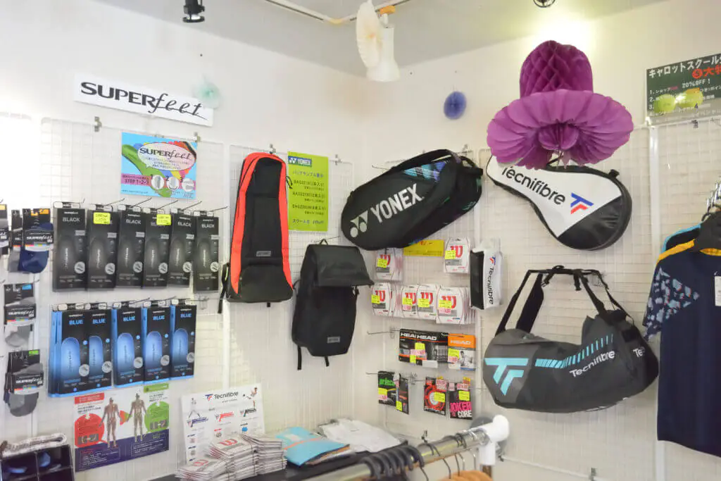 ラケットやシューズ、各種グッズまで、幅広く道具を取り揃えています。